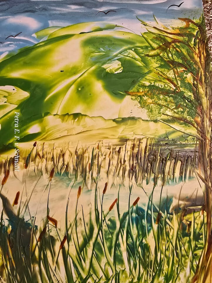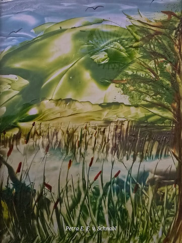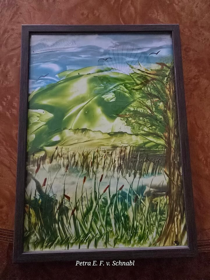 Enkaustik-Bild auf Wachspapier im A4-Format im Rahmen (hinter Glas) oder auf Leinwand mit Keilrahmen in verschiedenen Größen, auch die Hintergrundfarbe ist frei wählbar
